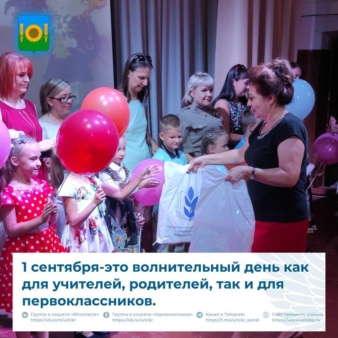 В 2022 году 11 первоклашек работников системы образования Урицкого района отправляются в долгий и интересный мир знаний. На сцену приглашались родители, члены Профсоюза-работники учреждений образования и их дети. Наборы канцелярских принадлежностей вручили детям Л.В.Гнеушева-начальник отдела образования и Л.М. Гриценко-председатель Урицкой районной организации Профсоюза, главный специалист, а еще дети были рады сладким шоколадкам и воздушным шарам!!!