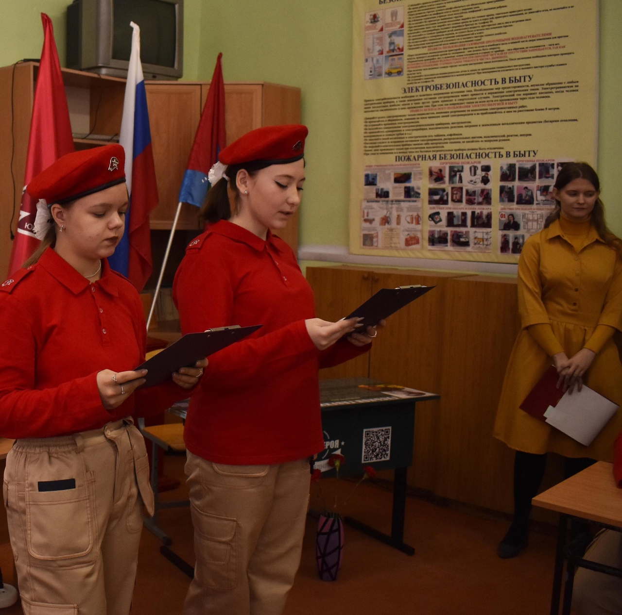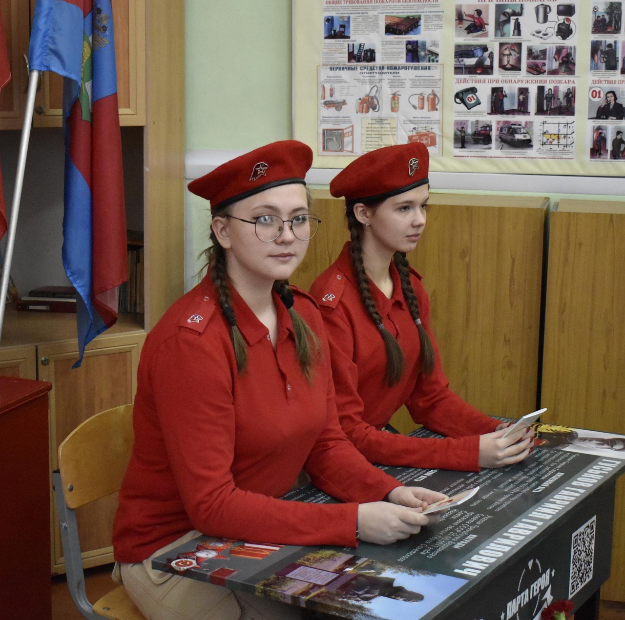 В честь Дня героев Отчества и открытия «Парты героя» в торжественной обстановке были приняты в ряды движения Юнармия обучающиеся 9В класса – Ефремова Карина и Пчелинцева Екатерина. Они же получили право первыми сесть за Парту героя.